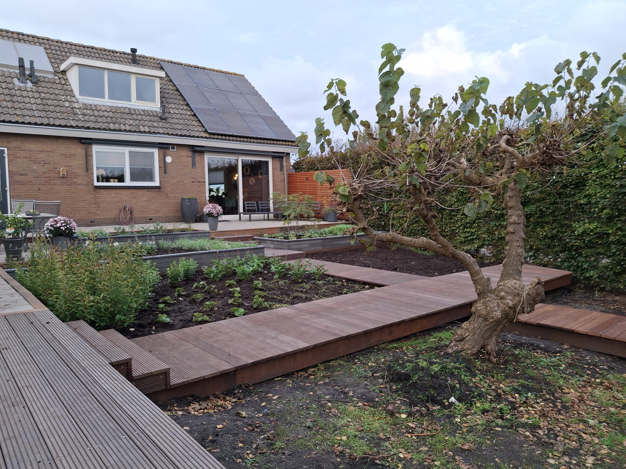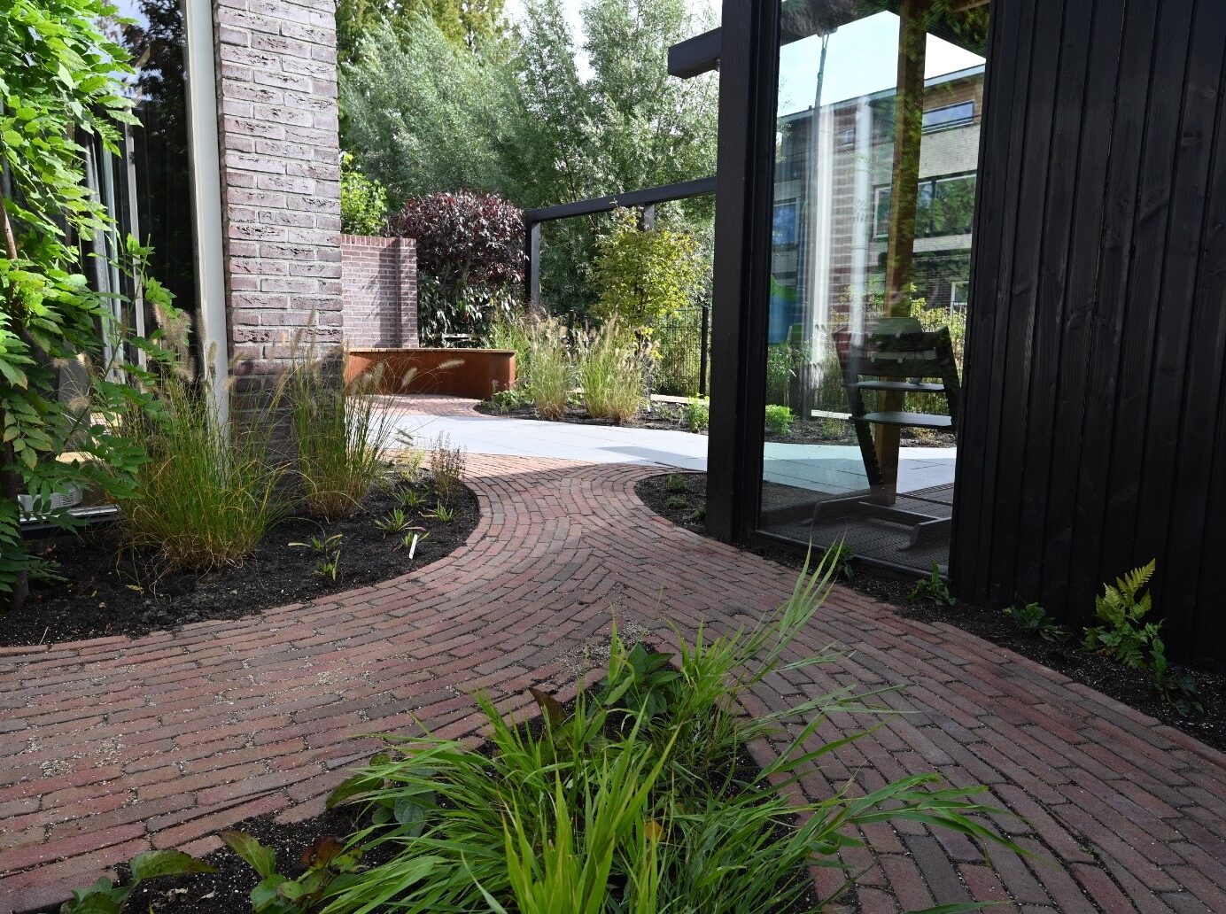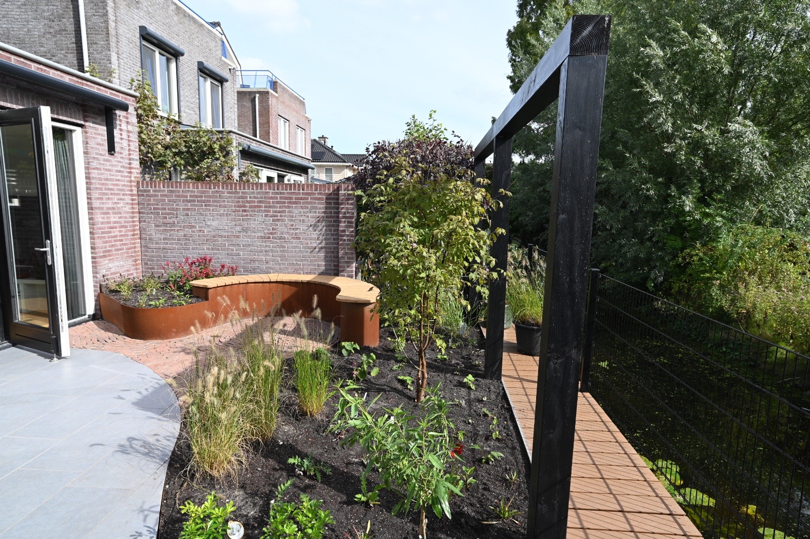 Achtertuin in de polder, strakke lijnen, hoogteverschil in de tuin