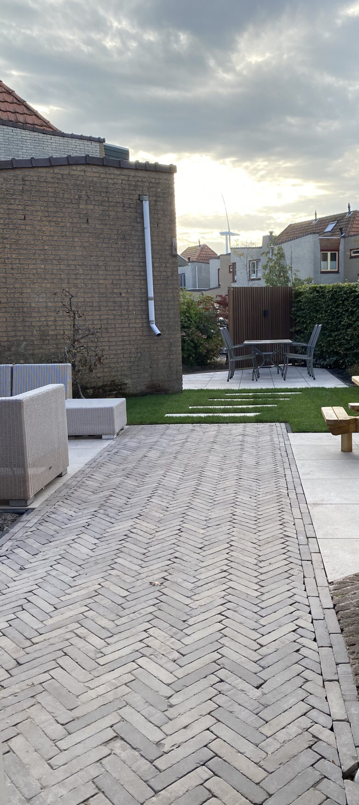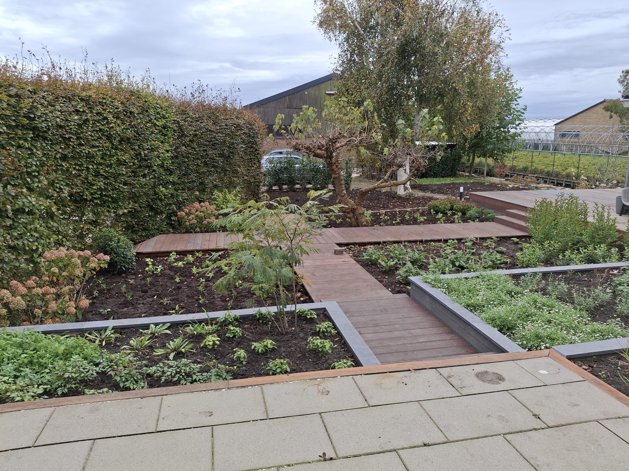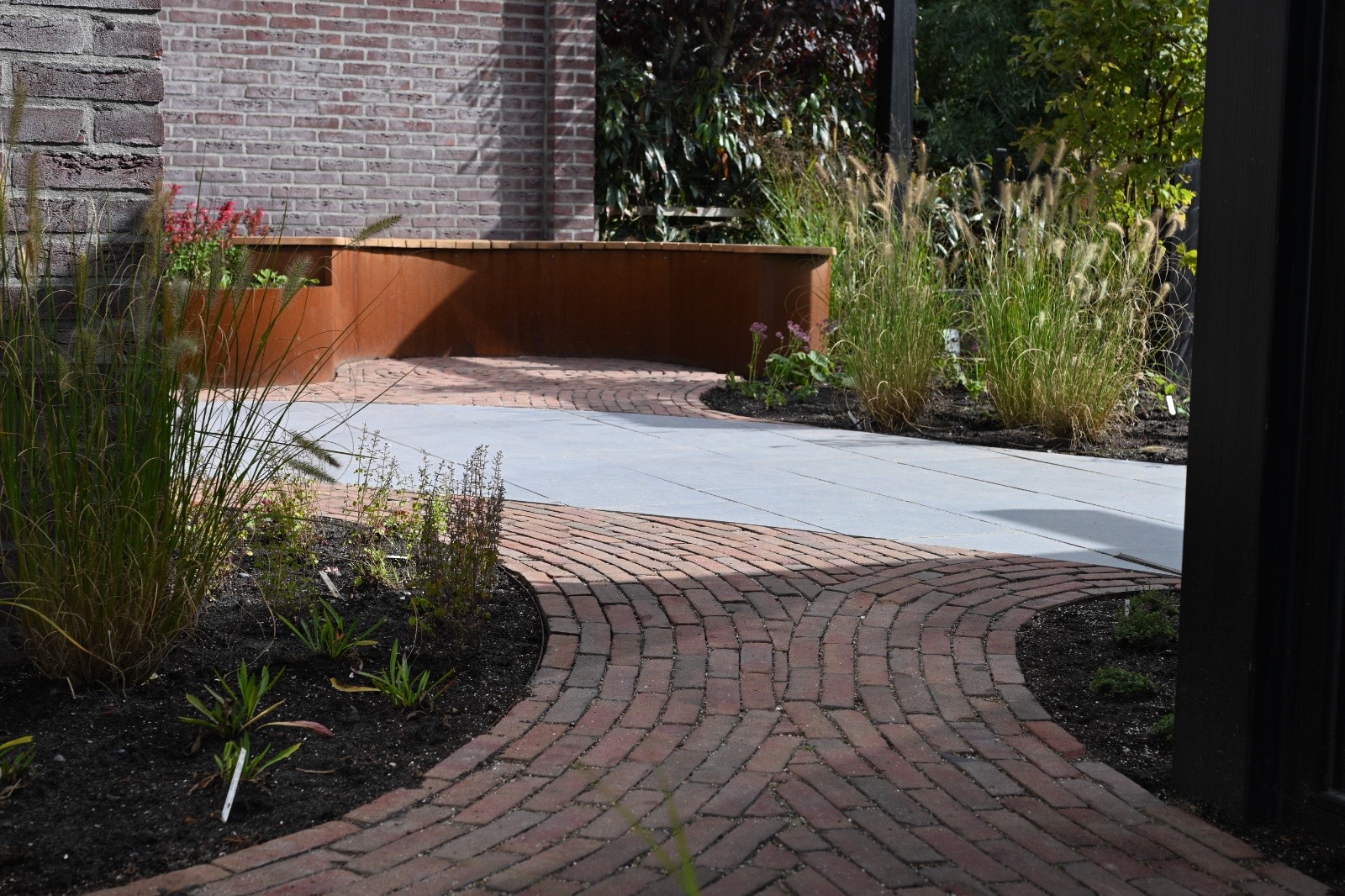 Achtertuin in de polder, strakke lijnen, hoogteverschil in de tuin