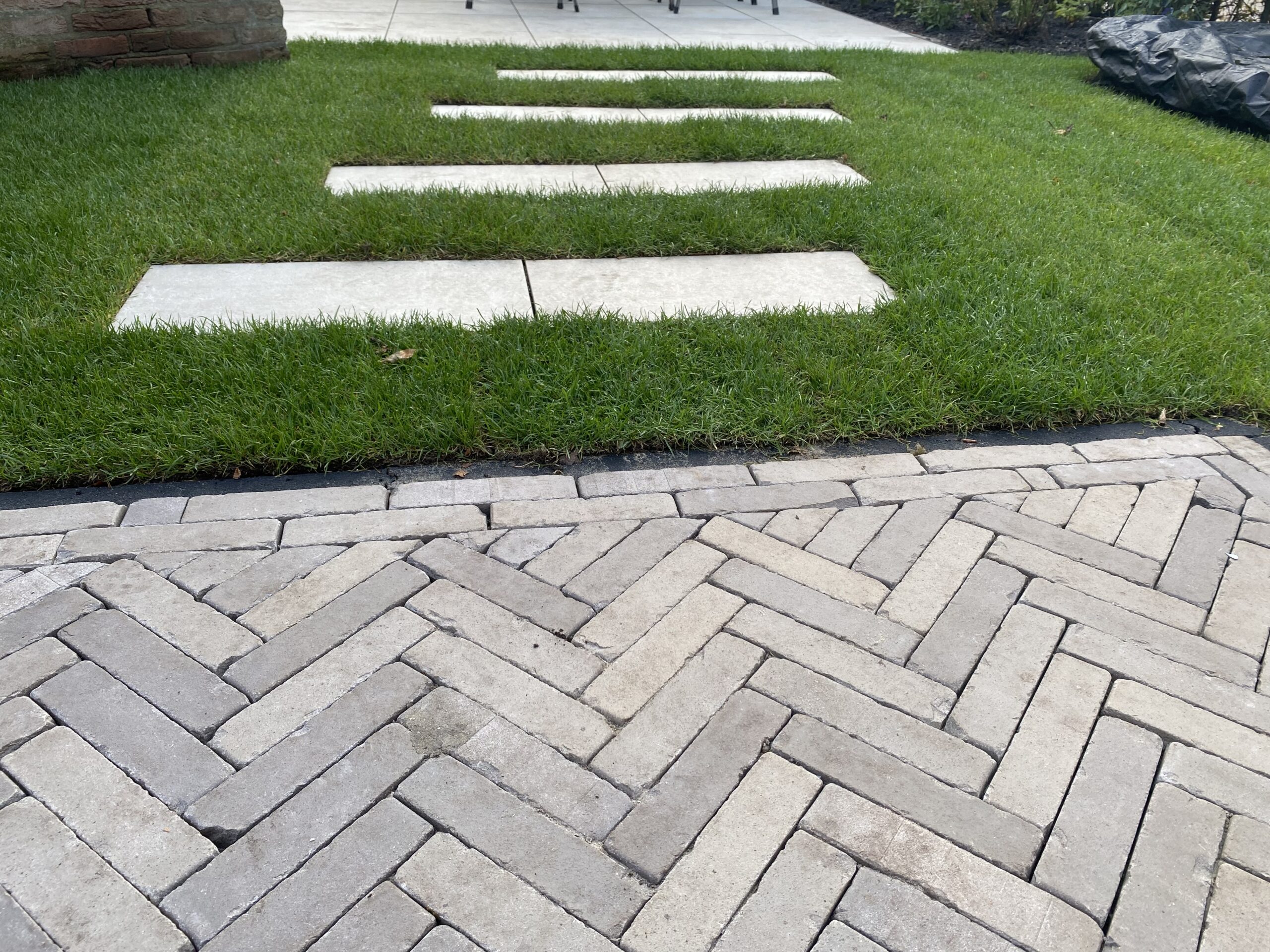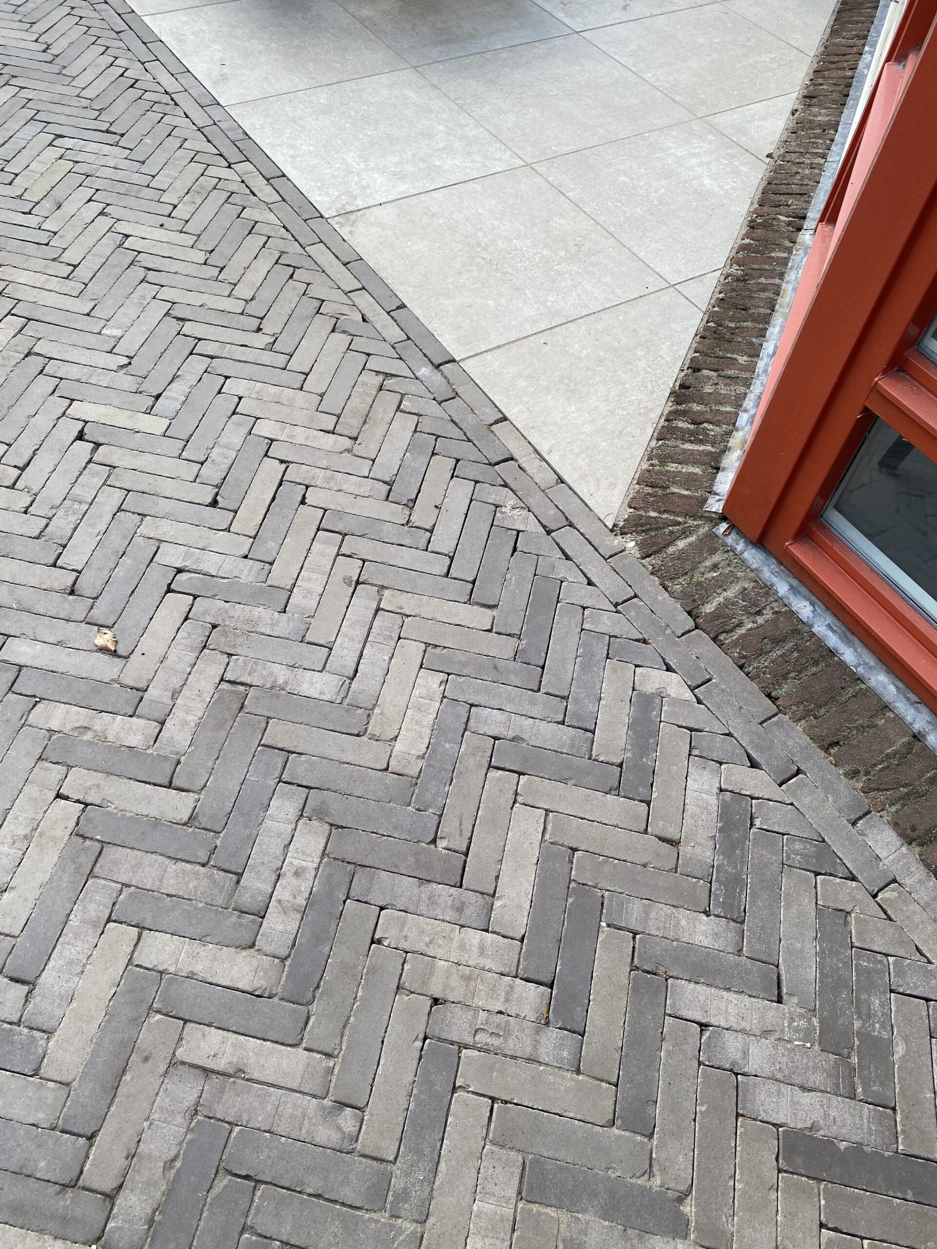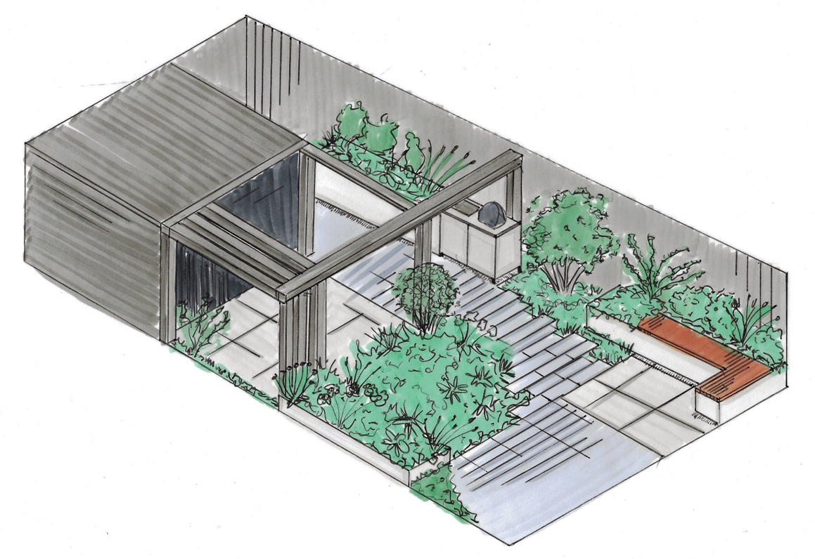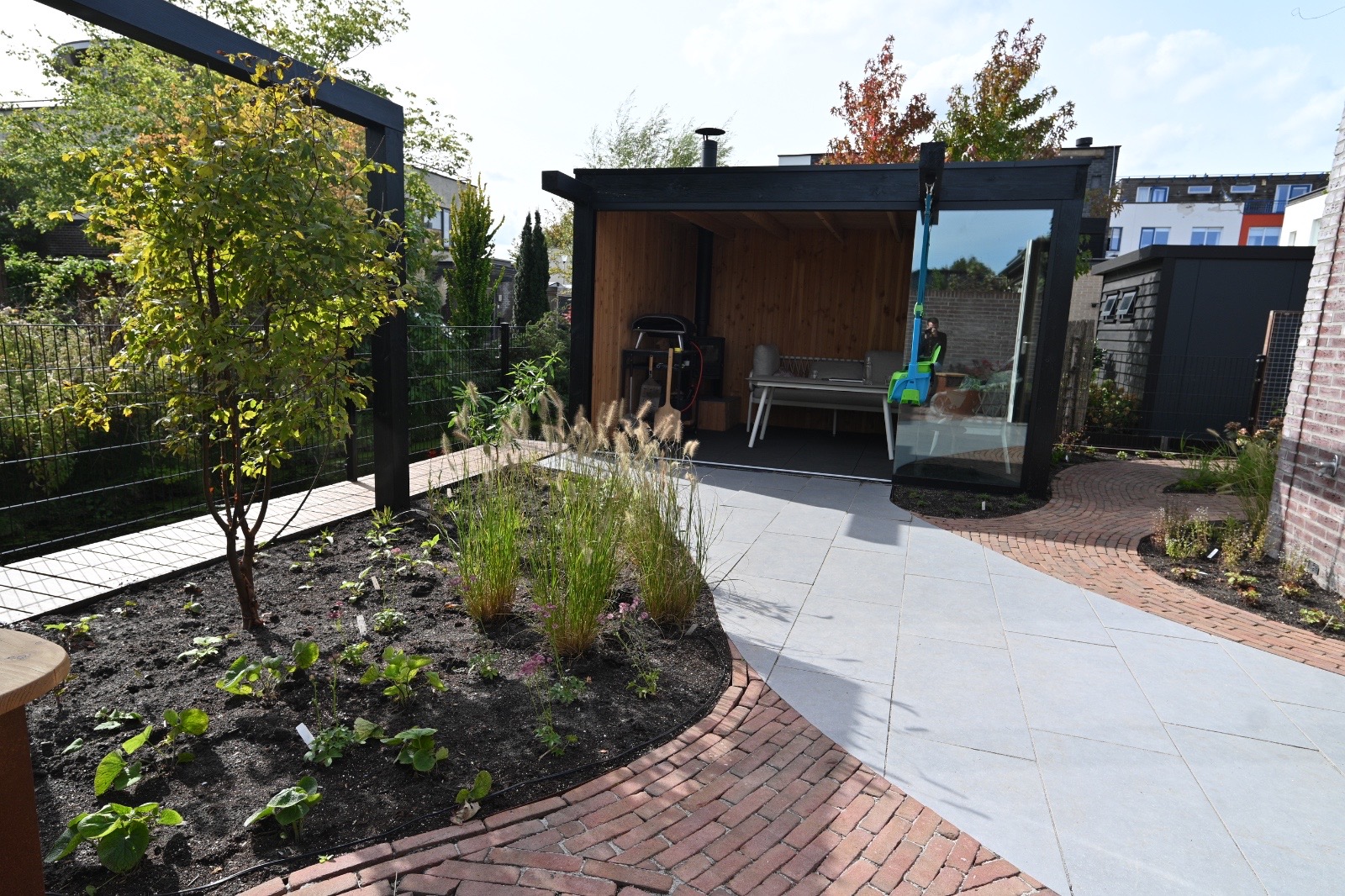 Een ontwerp van een achtertuin met ruimte voor spelende kinderen bij een bijzonder huis met allerlei driehoekige vormen, passen bijzondere lijnen in de tuin, gezellig zitten, stukje gras met hergebruik van planten door Sweet memories. Ik kan niet Wachten tot volgend jaar de beplanting gegroeid is.