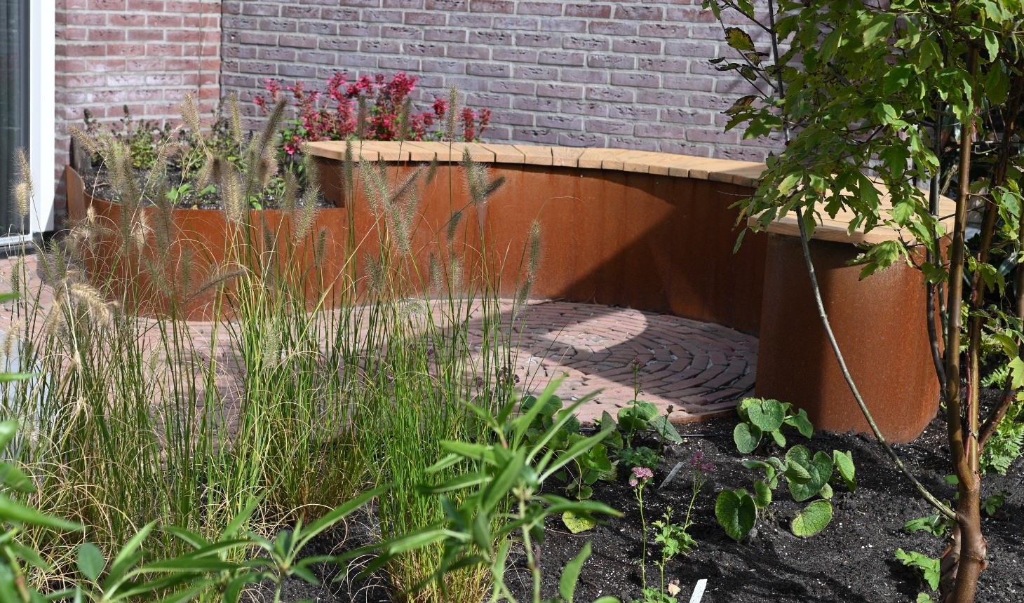 Een ontwerp van een achtertuin in Buckeskop kortom Boskoop met organische vormen, bankje om te zitten en genieten van gezelschap of een kopje koffie in de ochtendzon, door een glazen wand in de overkapping kun je ook in de winter buiten naar binnen halen in een besloten en open ruimte, nog even geduld tot het voorjaar van 2026 voor de groei van de planten.